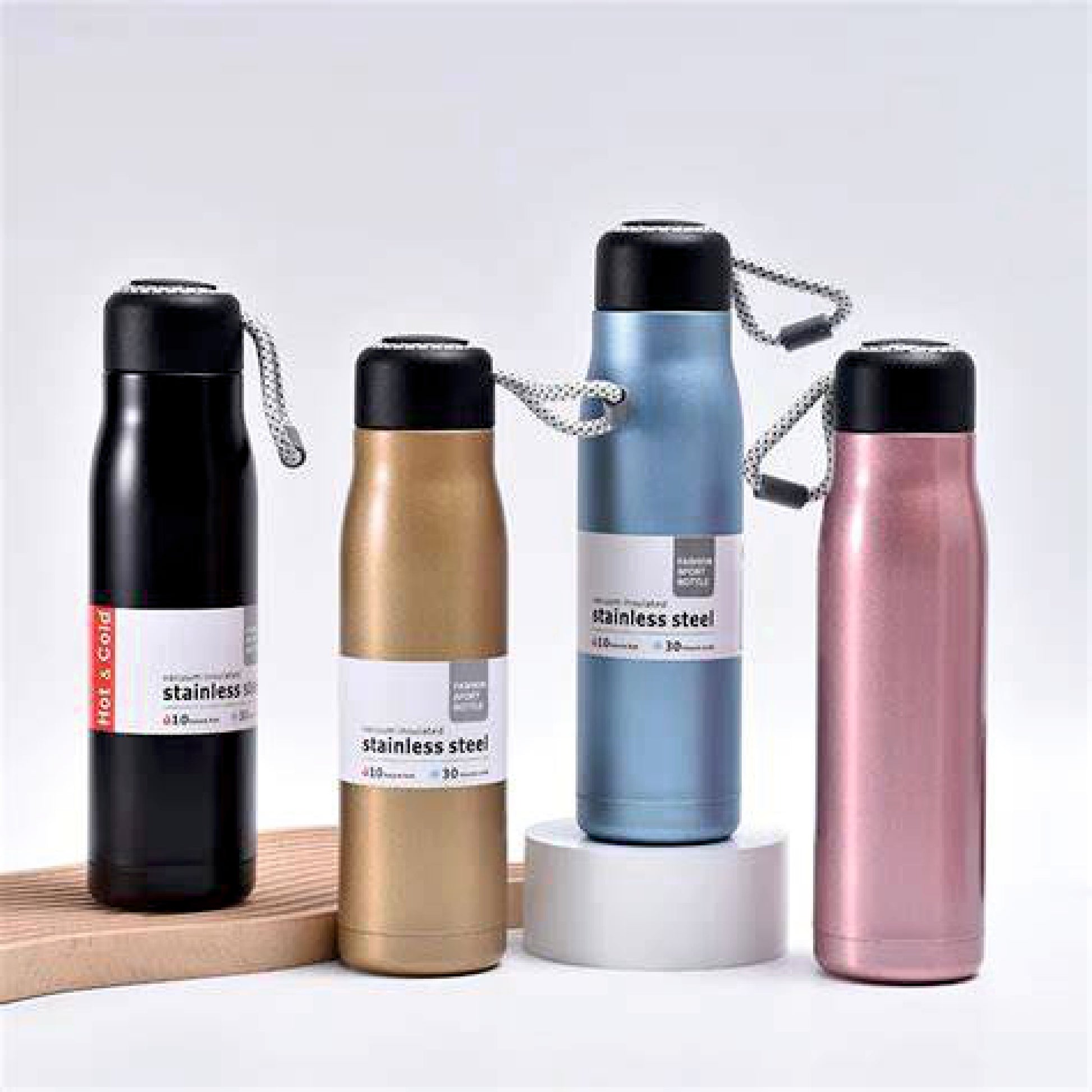Premium 500ml stainless steel thermos bottle designed for both hot and cold beverages. Features double-wall vacuum insulation, ensuring up to 12 hours hot and 24 hours cold retention. Durable, rust-free body with matte metallic finish, leakproof cap, and a sturdy carry strap – ideal for corporate gifting, office use, travel, gym, and daily hydration. Available in assorted elegant colors. Perfect for wholesale and B2B bulk orders.